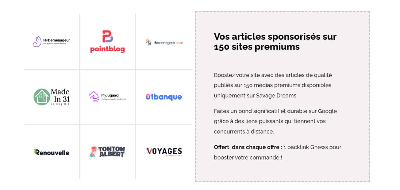 Encore une fois, Savage Dreams fait partie des endroits œuvrant dans la vente des liens. Vous pouvez avoir une meilleure base de site web sur lequel vous pouvez publier, dont des médias reconnus dans différents thématiques comme :